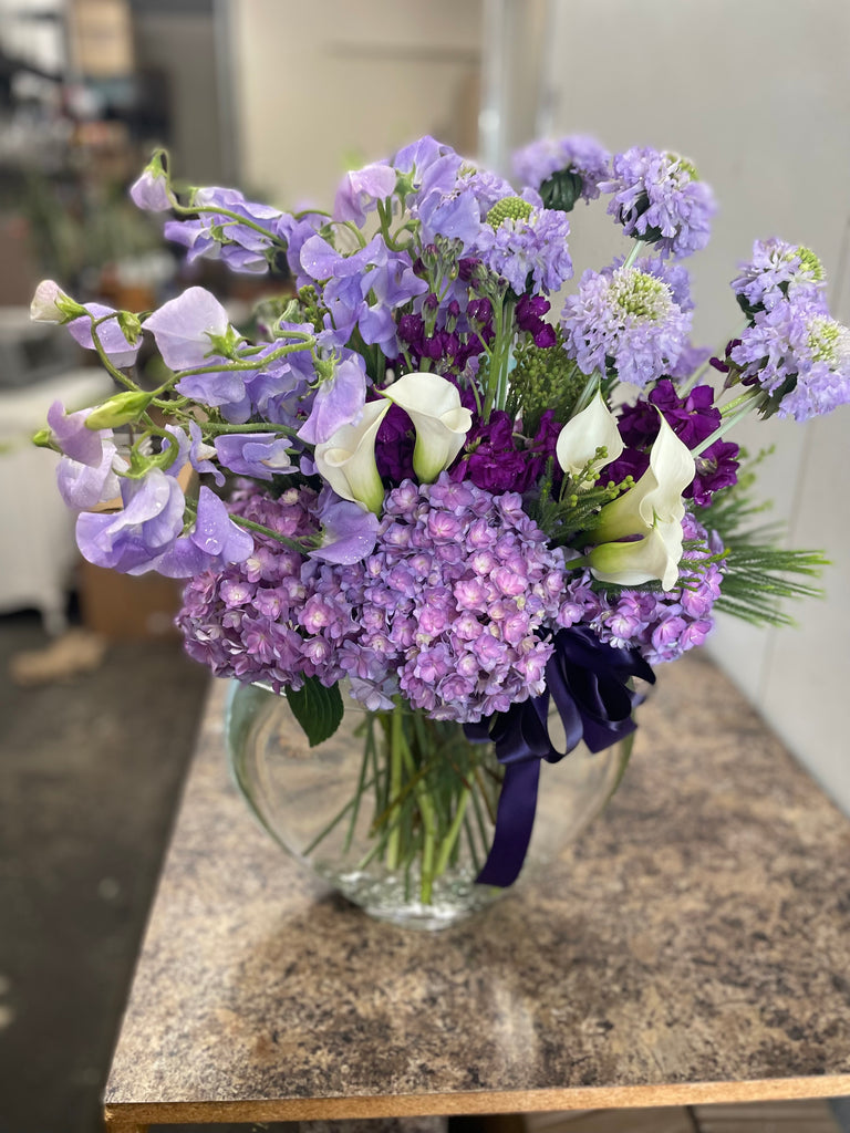 Stunning arrangement of available blooms in shade of lavender and purple with touch of white calla lilies.